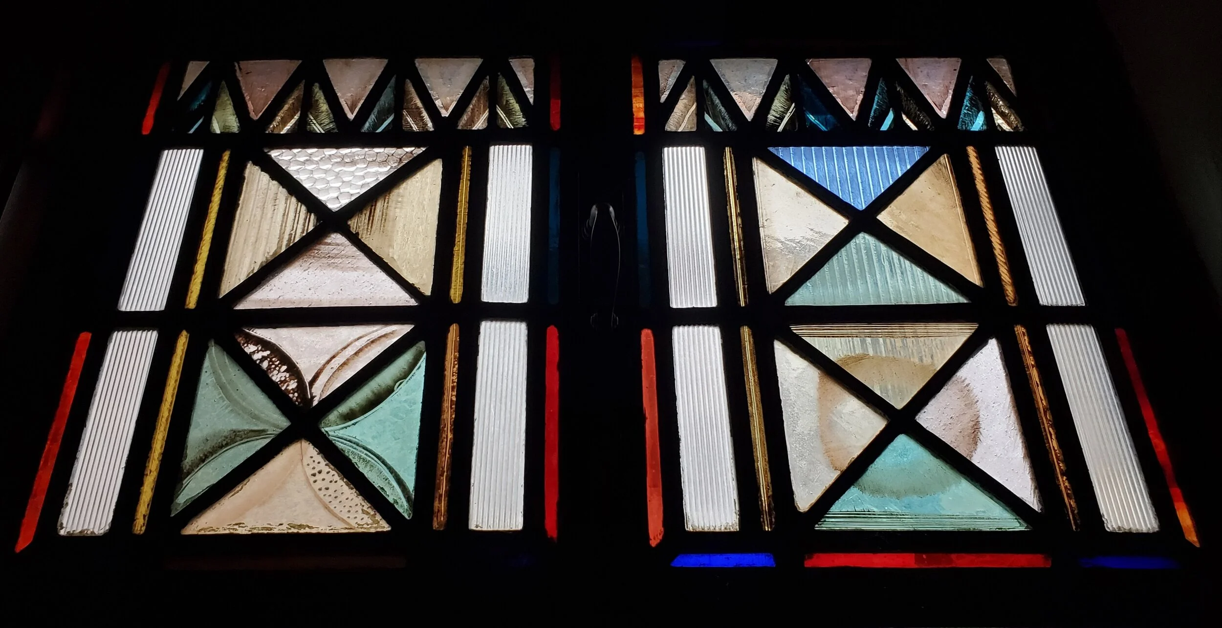 First time visitors to the Glasner Studio may not always pick up on the fact that the various stained glass windows throughout each of the Glasner Studio's rooms exemplify a different stylistic scheme. The pastel-toned art glass used for the windows in the Montgomery Bedroom come from a different stock than the richly colored stained glass Miller used in many of the other rooms of the house. Miller also chose for this bedroom a subdued, abstract geometric design that retains Miller's diverse experimental style while also presenting as uncharacteristically symmetrical and orderly.