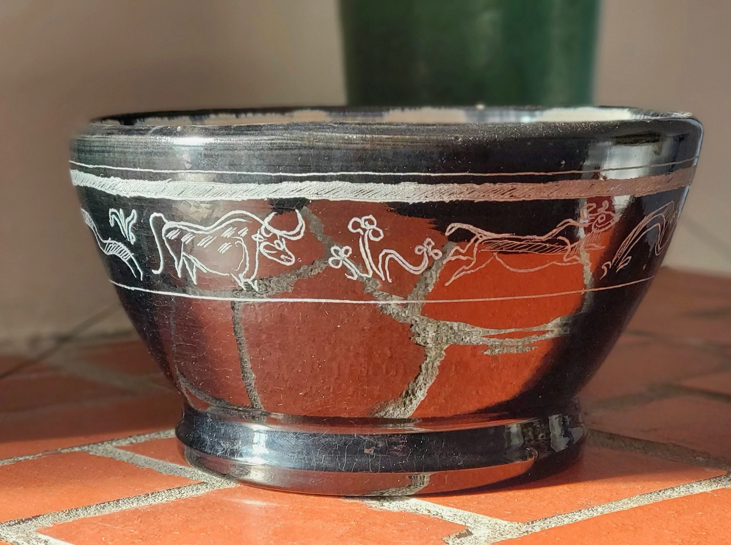 Miller was prolific in ceramic decoration and design. This particular bowl is a rare example for Miller, however, in that he employed a reductive technique for its illustrations. It features a glossy, light etched-glaze exterior with various animal and floral patterns encircling it. While the design motifs are trademark Miller figurations, the etching technique is only seen in one other example that he produced (which can also be found on the tour in the Gallery). This piece was first glazed in an almost lapis lazuli shade of blue and left to set; then Miller took a sharp-tip tool and lightly etched the patterns and designs into the hardened glaze. Compared to regular ceramic painting, mistakes would be much harder to cover up, and so a steady, light, and meticulous hand was necessary to create illustrations without cracking the glaze. Perhaps due to the difficulty of this technique, Miller did not fabricate too many ceramics in this style.