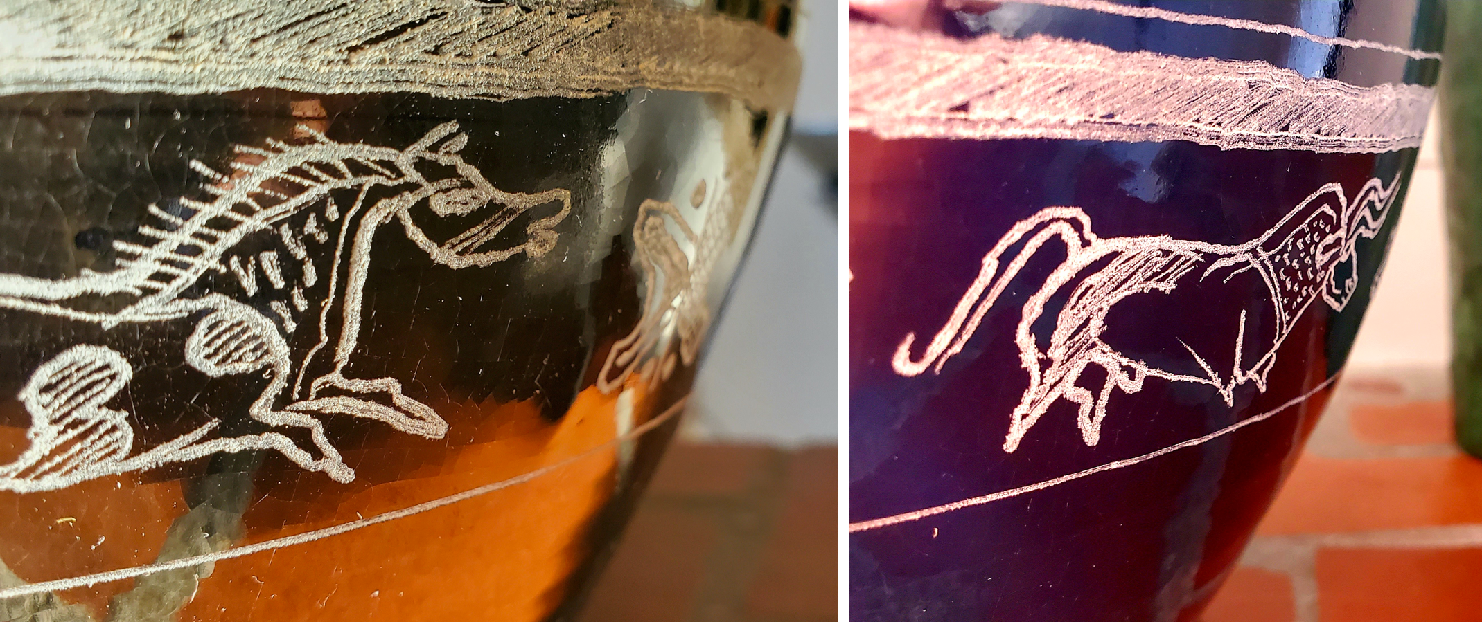 Etching details on blue serving bowl - Edgar Miller - c. 1939 - Edgar Miller Legacy Archive.