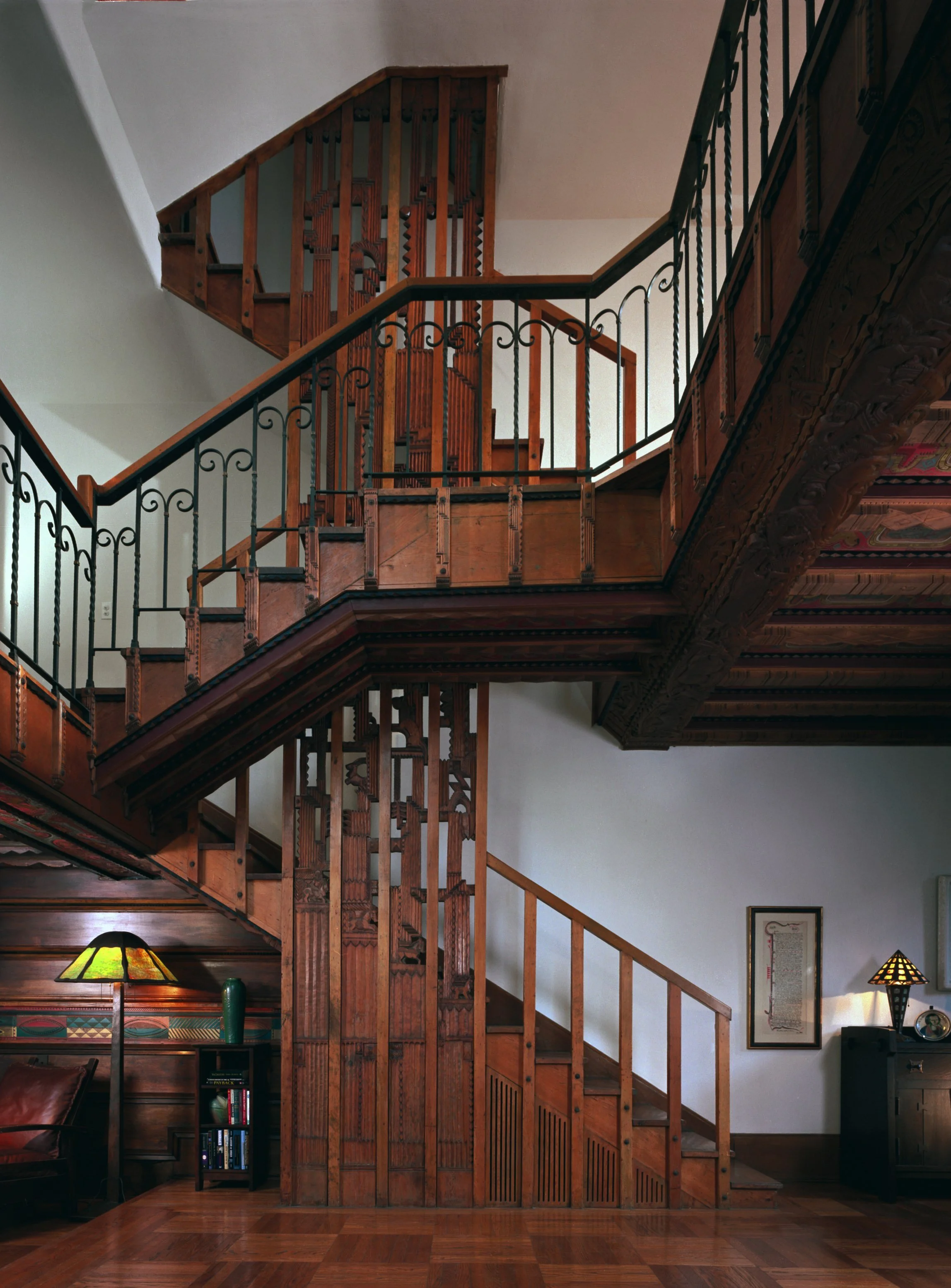 This staircase is a particularly interesting example of how Miller's three-dimensional work could be both a unique sculptural object, and a functional architectural or interior design element. Many carvings draw the viewer into their individualistic detail, while still creating a cohesive unity across multiple levels of the house, all the way up to the last level. Believed to be carved out of ponderosa pine, the screen is not structural but serves a very important purpose, making an almost closed space out of the stairwell and maintaining fluidity throughout the open air rooms. Miller's choice of figures includes several horses with a Native American rider atop one at the far left. Some have interpreted the staircase as a representation of the life of a young pony, growing up into a fully grown steed.