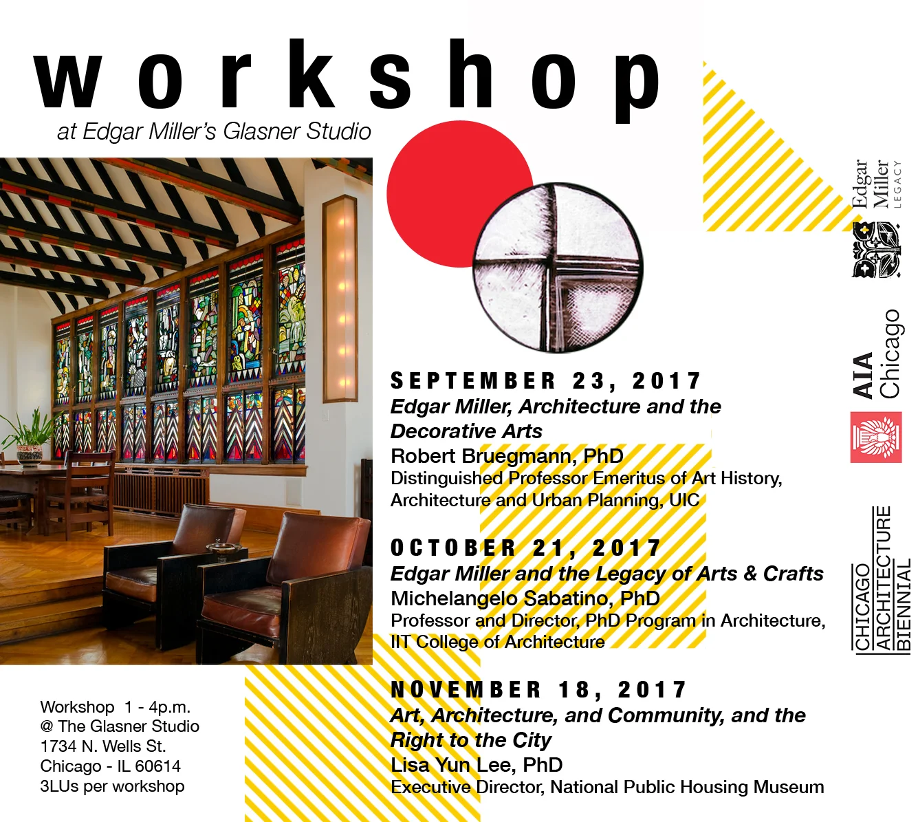 Edgar Miller Legacy is proud to offer partner programming with the Chicago Architecture Biennial. Edgar Miller Legacy, in partnership with AIA Chicago, offers three distinct workshops and tours held at the Kogen-Miller Studios featuring special guest lecturers who will speak to different aspects of Miller’s architectural achievements and how they relate to the wider world of architectural history, decorative arts, and community building. All workshops qualify for AIA Continued Education System credits, and include an in-depth tour of Edgar Miller’s Glasner Studio led by Edgar Miller Legacy Executive Director, Zac Bleicher.