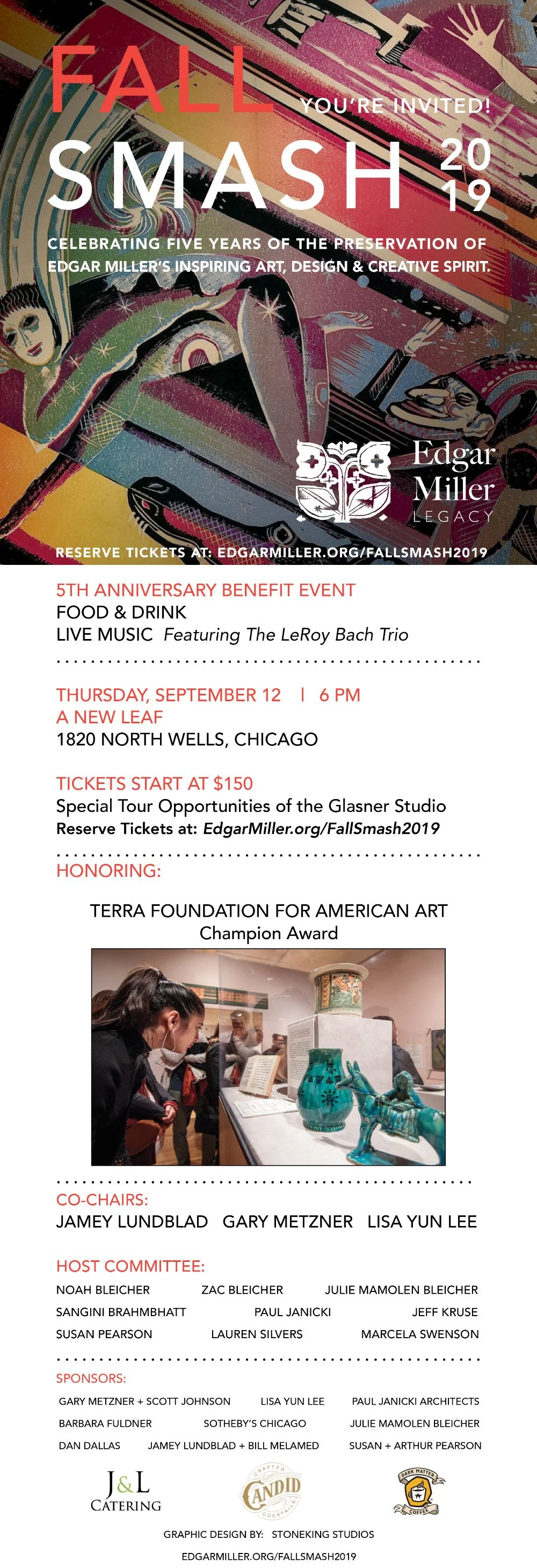 We were thrilled to have you to our 5th Annual Fall Smash! This year we were excited to have hold our event at A New Leaf in Old Town, Chicago on Thursday, September 12th. We celebrated our 5th year of preservation of Edgar Miller's incomparable artwork and creative spirit. The evening included a sumptuous dinner spread, tantalizing drinks, festive live music, a silent auction, and of course, unforgettable company.