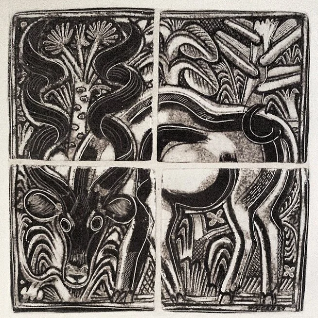 Painted tiles depicting a spiral-horned antelope - Edgar Miller - 1939 - Edgar Miller Legacy Archive