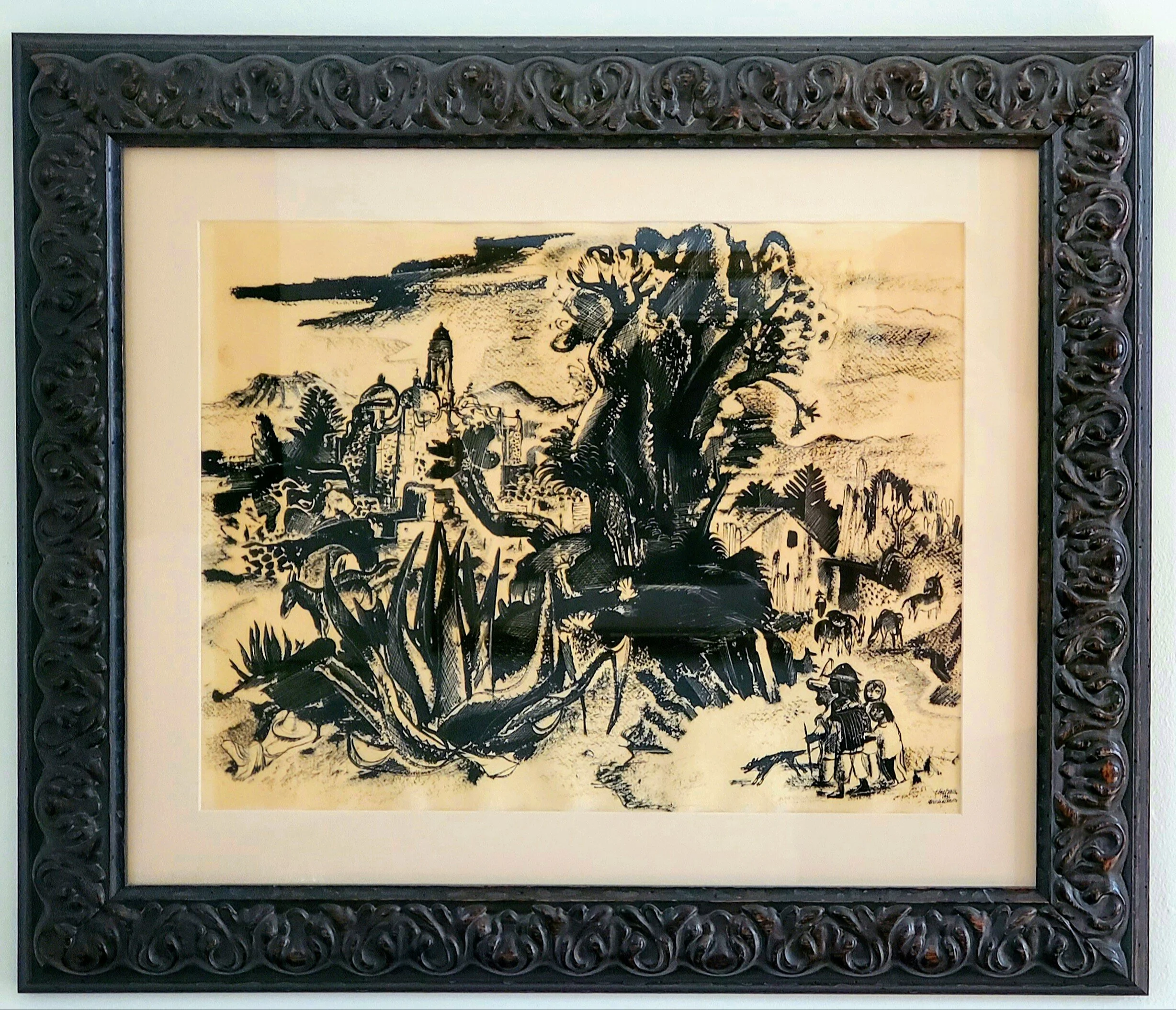 This unique painting, in black gouache, a paint very similar to watercolor, depicts a scene of the Mexican countryside, with travelers in the foreground making their way to a nearby puebla, or village. Some of Miller's early influences were the great artists and muralists that revolutionized Mexican modern art. Great painters including Diego Rivera, José Clemente Orozco, and David Alfaro Siqueiros had become increasingly popular not only in their native country but internationally, and particularly in the Midwest, where these artists garnered attention and work for their commissioned projects and exhibitions.