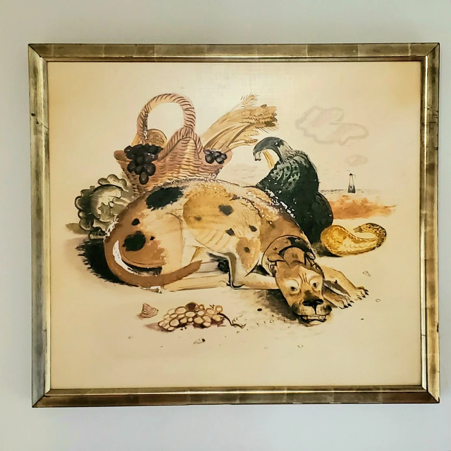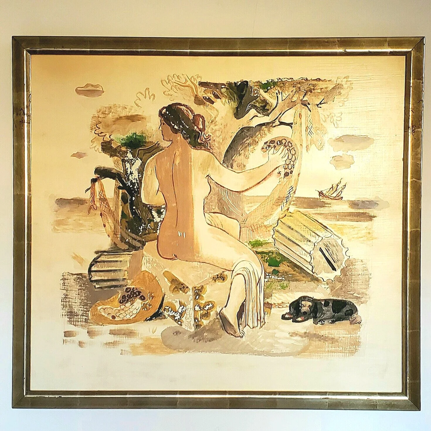 Two of the paintings portray different breeds of dogs who appear to act as sentinels; two others portray nude female figures admiring the landscape. One figure appears to be wringing out her wet hair, while the other is holding some kind of sea sponge which she may have just caught with the netting hanging from the tree behind her. A jolly and proud horse trots in the background along the shoreline; seashells litter the foreground. A boat is seen coming in from the sea, and many small details like the plants and the waves jump off the canvas through Miller's rapid brush strokes.