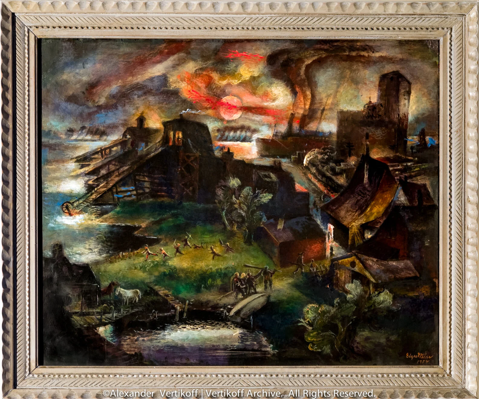 While Miller was mostly known as a wizard interior and graphic designer, his repertoire extended to many more mediums and it should come as no surprise that he was a fine painter, too. This painting depicts a scene of industry, shipping, and neighboring countryside. It was exhibited at the Art Institute of Chicago in 1934.